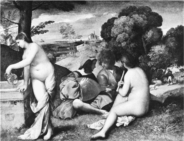 Рис. 2. Джорджоне (?). Сельский концерт. Масло, холст, 110 × 138 см, около 1505–1510, Париж, Лувр. – Полотно, приписываемое Джорджоне и известное под поздним названием «Сельский концерт», вызвало множество толкований. В центре изображена сцена музицирования: обнаженная женщина с флейтой, игрок на лютне и, возможно, певец.