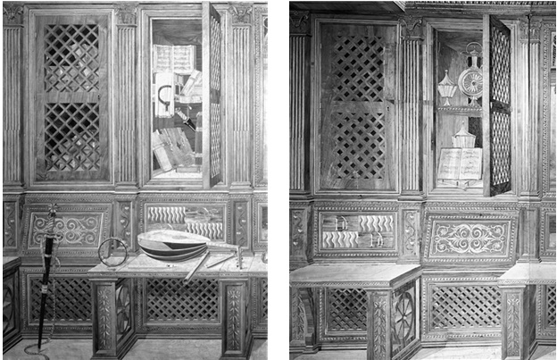 Рис. 3. Неизвестный мастер. Студиоло. Интарсии. Палаццо Дукале, Урбино. – Слева: деталь западной стены: шкаф для хранения редкостей с выставленным в нем анонимным мотетом «Bella gerit musasque colit». – Справа: деталь северной стены – книжный шкаф с полотнищем (на нем – орден Подвязки), бумажной полоской (с заимствованным из Вергилия девизом «VIRTUTIBUS ITUR AD ASTRA» («Через доблесть достигают звезд»)) и песенником, раскрытым на анонимном рондо «J’ay pris amour». – Работы над студиоло Федерико де Монтефельтро в герцогском дворце велись, по-видимому, до 1476 года. В интарсиях западной и северной стен представлены разные контексты музыки. Рукопись со светской песней находится в книжном шкафу, а запись мотета – в шкафу для хранения редкостей и сокровищ, в окружении произведений прикладного искусства.