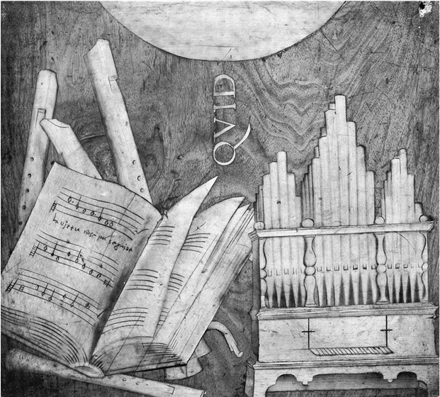 Рис. 4. Лоренцо Лотто. Интарсия из цикла, украшающего спинки кресел в пресвитерии базилики Санта-Мария-Маджоре, Бергамо. 29,9 × 33,9 см, 1525, работа выполнена несколькими мастерами-инкрустаторами. – Интарсии базилики Санта-Мария-Маджоре, эскизы которых создал Лоренцо Лотто в 1524–1525 годах, раскрывают сложную изобразительную программу. Одна из панелей посвящена музыке. Расположение органных труб не имеет сходства с реальным инструментом, на котором можно было бы играть. Тем не менее очевидно, что художник стремился запечатлеть музыку в ее конкретности, реальности.