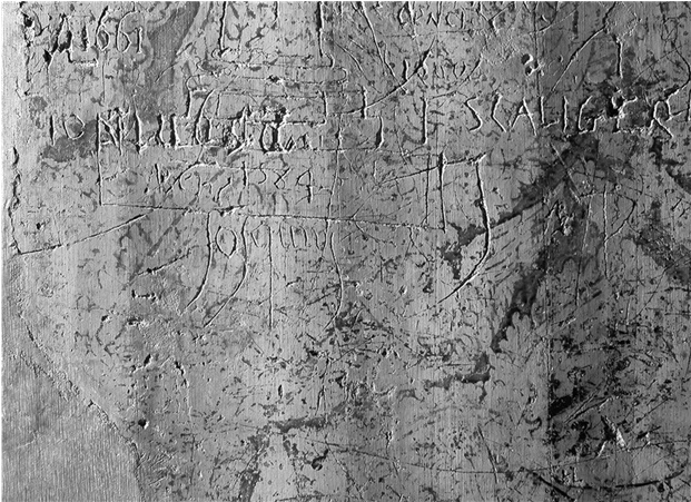 Рис. 5. Ватикан, Сикстинская капелла, деталь западной стенки кантории (состояние после реставрации). – Граффити, обнаруженные при реставрационных работах, почти без исключений приписываются певчим папской капеллы. Певчие увековечили в камне свои имена, иногда сопроводив их дополнительными сведениями. Этот обычай существовал уже с самого возникновения Сикстинской капеллы, о чем свидетельствует имя Жоскена Депре. Среди других певцов, увековечивших себя таким образом, были Якоб Аркадельт, Карпантрас и Аннибале Дзойло.