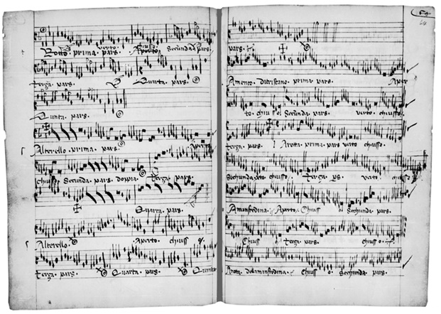 Изобразительные искусства в конце XV и на протяжении XVI века по-разному указывают на событийное качество музыки. Около 1476 года было создано урбинское «студиоло» Федерико да Монтефельтро. В технике инкрустации (интарсии) здесь воспроизведены даже музыкальные рукописи – мотет и песня. В этом тоже можно видеть новацию: созданные композиторами произведения представлены вне зависимости от музыкального исполнения (рис. 3). При этом контексты тщательно дифференцированы: светская песня находится в книге, стоящей среди других книг; мотет помещен в сокровищницу для хранения редкостей. Примечательно, что книжный шкаф или шкаф для редкостей и ценных предметов – это не те места, где реально живет музыка. Зато в координатах придворной культуры они обозначали те места, где аккумулируется память. Таким образом, музыка рассматривается как объект хранения и воспоминания.