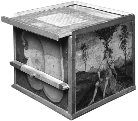 Рис. 7. Неизвестный мастер. Так называемый «Ларец Цельтиса», 31 × 31 × 31 см, 1508, Вена, Музей истории искусств. – Ларец, который Конрад Цельтис (1459–1508) поручил изготовить незадолго до смерти, предназначался для регалий, полученных им при увенчании в качестве поэта-лауреата; это событие имело место на Нюрнбернгском рейхстаге 1487 года, в присутствии Фридриха III, императора Священной Римской империи. Начиная с 1497 года Цельтис преподавал в Венском университете, а потому и ларец был сработан в Вене. Сидящий на Парнасе Аполлон играет на фиделе – в этом образе воплотилось и поэтическое самосознание Цельтиса, и в то же время апелляция к античной музыке (притом что тогдашние представления о ней не были и не могли быть сколько-нибудь конкретными).
