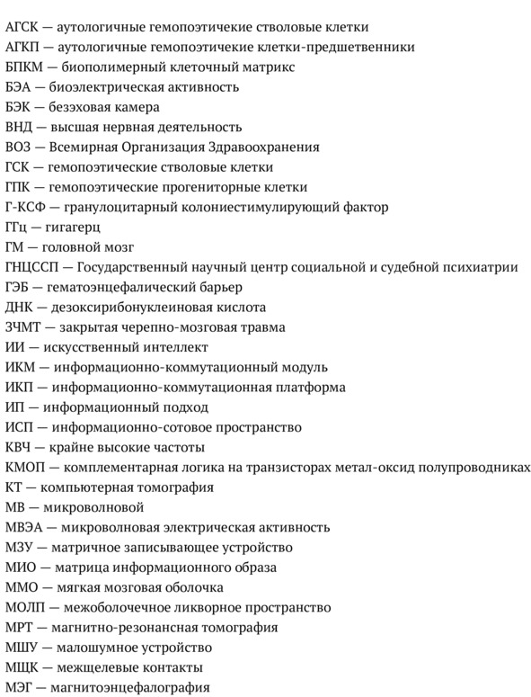 Написать книгу о современной нейроинженерии и перспективных нейротехнологиях мы задумали достаточно давно, т.к. наша команда врачей-неврологов и нейрохирургов, нейробиологов, физиков, инженеров, математиков и программистов уже более 30 лет активно интересовалась и увлеченно занималась в эксперименте на животных и в клинике нервных болезней проблемой реставрации поврежденной нервной ткани и восстановлением нарушенных функций головного и спинного мозга у человека и животных. Уже более 30 лет нами применялись самые передовые для своего времени и для нашей страны биомедицинские и нейробиоинженерные технологии реставрации мозга. На протяжении этих долгих лет нами был реализован в эксперименте и применен в клинике очень широкий спектр современных биомедицинских нейротехнологий, направленных на реконструкцию и восстановление анатомо-морфологической структуры участков поврежденного спинного и головного мозга человека. Для нейрореставрации поврежденного головного и спинного мозга в конце прошлого века (1989—2000) нами применялись трансплантации фетальных клеток и клеток пуповинной крови человека, аутологичных нейральных стволовых и прогениторных клеток, полученных из обонятельной выстилки носа пациента, а также транскраниальная магнитостимуляция мозга и имплантация нейростимуляторов головного и спинного мозга человека (Брюховецкий, 2003; Брюховецкий, 2010; Брюховецкий, Хотимченко, 2018; Брюховецкий и др., 2018). Последние два десятилетия XXI в. мы активно развивали терапевтические нейротехнологии реставрации поврежденного мозга с использованием интратекальных и интравентрикулярных цитотрансфузий аутологичных и гаплоидентичных (близкородственных) гемопоэтических стволовых клеток (ГСК) костного мозга (более 17 тыс. трансплантаций у 5 тыс. человек), мобилизованных в периферическую кровь гранулоцитарным колониестимулирующим фактором (Г-КСФ). В 2005 и 2006 гг. эта биомедицинская нейротехнология была официально разрешена в Российской Федерации к клиническому применению Минздравом России и Росздравнадзором и была зарегистрирована в реестре новых биомедицинских технологий Минздрава России. Другой нейротехнологией стали наши исследования по интервенционной биоинженерии головного мозга с использованием малоинвазивных, стереотаксических и рентгенохирургических способов реконструкции мозга (более 300 операций на человеке с программной региональной перфузией, стентированием и балонной ангиопластикой, стереотаксической нейротрансплантацией и имплантацией нейростимуляторов) и операций по тканевой инженерии с имплантацией гетерогенного матрикса «СфероГель»ТМ у 104 пациентов с последствиями травм спинного мозга и имплантации биодеградируемых биополимерно-клеточных нейроэндопротезных систем.