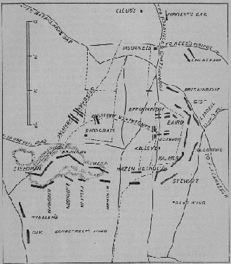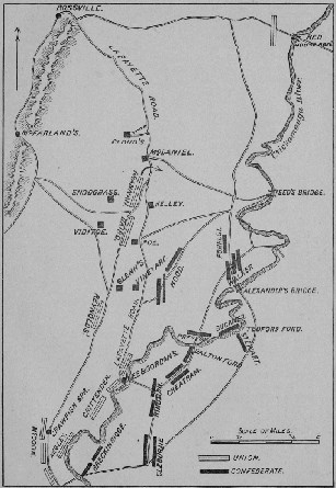 A glance at the map will show the rearrangement of the Union line. Beginning on the left, which covered Bragg's objective – namely, the control of the Lafayette road to Chattanooga – Baird, Johnson, Palmer, and Reynolds were withdrawn slightly from the ground on which they had fought the day before, and placed in strong position in the edge of the woods which skirted the Kelly farm. Brannan remained near the position to which he had been called to support Reynolds the night before. The divisions of Negley, Wood, Davis, and Sheridan and the brigade of Wilder had all been drawn back of the Lafayette road, their lines being slightly advanced from the road, leading from Crawfish Springs to the Lafayette road at Kelly's farm.