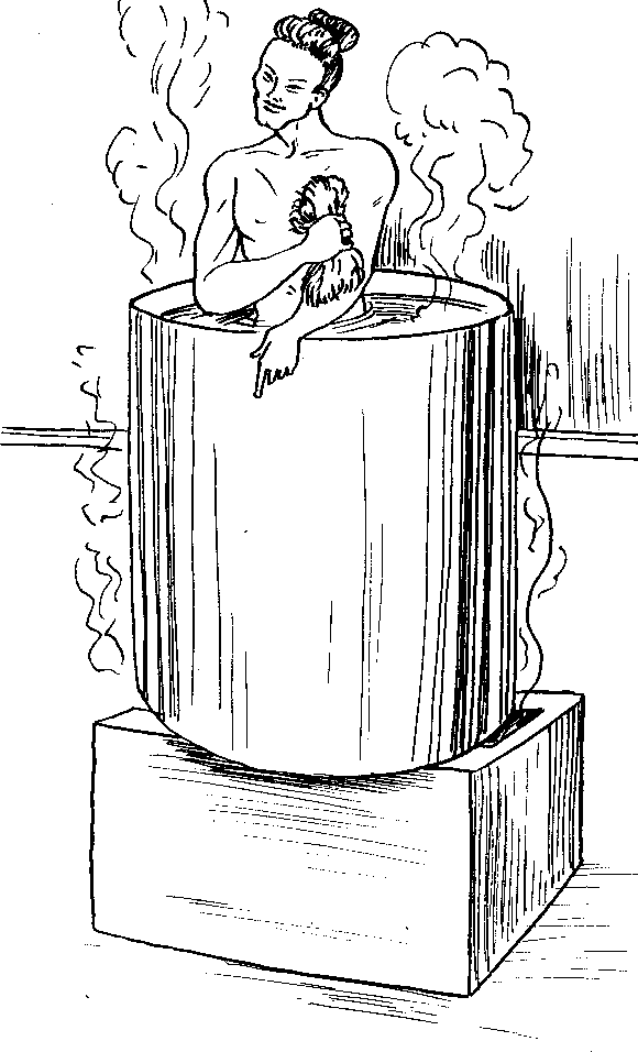 Уже в конце XVII – начале XVII веков в Европе повсеместно строились бани; правда, чаны для купания в них так и оставались «общими», в них мылись одновременно до пяти человек. А вот в банях для аристократии каждому предлагалась индивидуальная кадушка, и это было настоящей роскошью! Вода для купания в таких банях нагревалась довольно хлопотливым способом: в специальном помещении располагались огромные котлы, наполненные холодной водой. В этом же помещении в специальных печах нагревались большие камни. Когда камни раскалялись добела, банщики вытаскивали их клещами из печи и опускали в чан с водой. Для того чтобы нагреть до необходимой температуры котел воды, требовалось погрузить в него не один десяток раскаленных валунов, а на всю процедуру уходило не менее часа тяжелого труда.