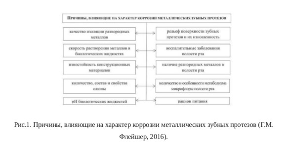 По данным Фрейдин Л. И., Гройсман А. Ш. (1989), ионы металлических сплавов влияют на изменение электропроводности ротовой жидкости, что, в свою очередь, способствует закислению слюны и развитию гальванизма (см. Рис.1).