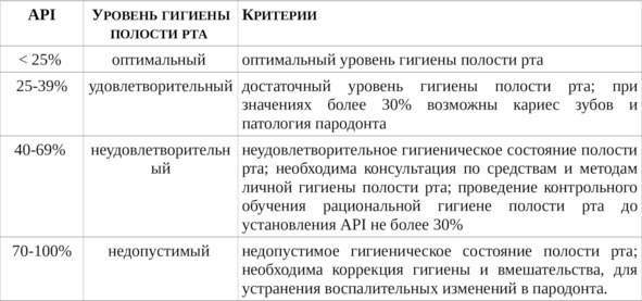 Рассчитывают только наличие или отсутствие налета. Значение индекса выражают в процентах, учитывая долю загрязненных межзубных промежутков. Достоинством API является то, что в отличие от индексов Quigley и Hein, он обсуждает гигиеническое состояние наиболее опасных зон. API рассчитывают по следующей формуле:
