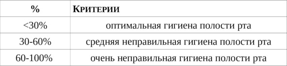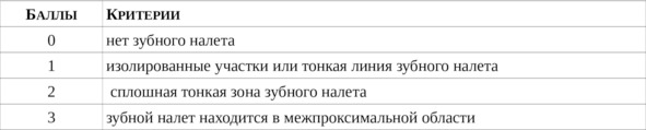 После окрашивания налета оценивают его наличие (в форме ответа «да/нет») на апроксимальных поверхностях. Устранение налета на этих участках требует от пациента особенно тщательного проведения гигиенических мероприятий. Поэтому, оценивая состояние зубного налета на апроксимальных поверхностях, можно определить уровень выполнения пациентом гигиенических мероприятий и, следовательно, степень его сотрудничества с лечащим врачом.