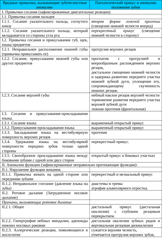 Взаимосвязь вредных привычек, вызывающих зубочелюстные аномалии, патологический прикус и аномалии положения зубов (Г. М. Флейшер, 2007).