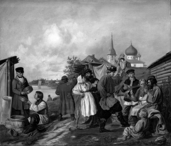 А. А. Попов. Народная сцена на ярмарке в Старой Ладоге. Публикуется с любезного разрешения Государственного Русского музея. Санкт-Петербург
