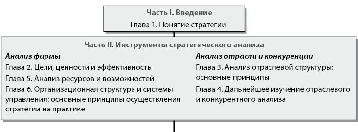 Предлагаемая схема стратегического анализа (см. рис. 1.2) включает четыре компонента: цели и ценности фирмы, ее ресурсы и возможности, структуру и систему управления, а также состояние бизнес-окружения. В главах части II рассматриваются все эти компоненты. Мы начнем с целей и ценностей, а затем рассмотрим, насколько эффективно фирма достигает поставленные цели.