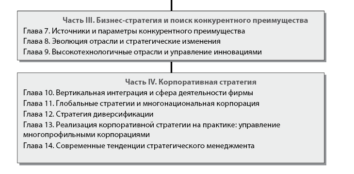 Следующая стадия – дальнейшее изучение базовой схемы стратегии, изображенной на рис. 1.2. Каждый элемент этой схемы – цели и ценности, бизнес-окружение, ресурсы и возможности, структуры и системы – будет подробно рассмотрен в пяти главах части II книги. Затем мы воспользуемся этими инструментами для анализа методов поиска конкурентных преимуществ в контексте разных видов бизнеса (часть III) и формулирования бизнес-стратегий (часть IV). На рис. 1.8 изображена структура этой книги.