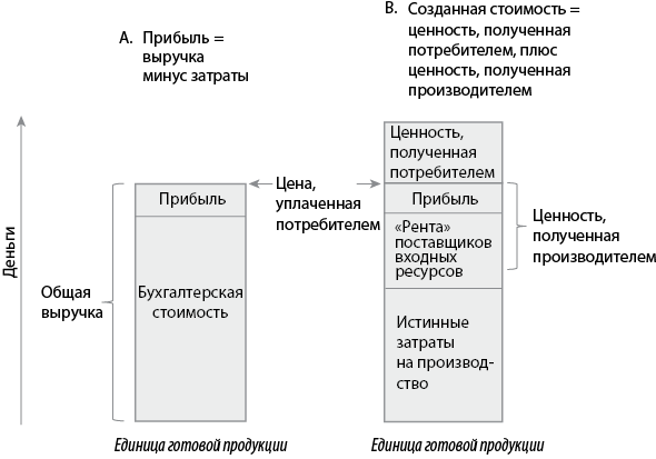 Итак, созданная ценность – это то же самое, что и прибыль, или нет? Нет: как показано на рис. 2.1, создаваемая стоимость обычно превышает прибыль. Прибыль – это выручка за вычетом затрат (см. рис. 2.1А). Но ценность, полученная клиентами, как правило, больше, чем та сумма, которую они платят. Она измеряется их готовностью платить, а не тем, сколько они платят на самом деле. Эта разница называется потребительским излишком[4]. Точно так же реальная себестоимость производства обычно меньше бухгалтерских издержек фирмы, поскольку владельцы входных производственных ресурсов (особенно наемные работники) обычно получают больше, чем тот минимум, который им необходим для того, чтоб предоставить свои ресурсы для производства данного продукта. Излишек производителя состоит из прибыли, которая достается владельцам фирмы вместе с рентой (избыточной прибылью), полученной владельцами ресурсов.