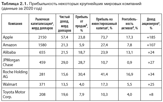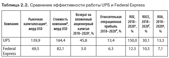 Оценка эффективности деятельности – взгляд в будущее: стоимость ценных бумаг на фондовом рынке. Если цель нашей фирмы состоит в том, чтобы максимизировать прибыльность в течение всего периода существования, то для оценки эффективности ее работы необходимо рассмотреть динамику ее прибылей (или денежных потоков), которая будет иметь место в течение всего времени ее существования. Проблема, конечно, в том, что мы можем сделать это в перспективе только нескольких лет. Для публичных компаний лучшей доступной оценкой чистой приведенной стоимости (NPV) ожидаемых в будущем денежных потоков (за вычетом платежей по процентам) является то, как к этим компаниям относится фондовый рынок. Таким образом, чтобы оценить эффективность деятельности фирмы по созданию рыночной стоимости, мы можем изучить динамику курса акций фирмы по сравнению с ее конкурентами за некий период (желательно за несколько лет). Так, на рынке доставки посылок и грузов United Parcel Services, Inc. (UPS) имела рыночную капитализацию и стоимость компании, которые превышали аналогичные показатели ее конкурента FedEx Corp. (см. табл. 2.2). В таком случае ожидается, что UPS в будущем будет генерировать больший денежный поток, чем FedEx (в основном из-за своего большего размера и более высокой прибыльности). За период 2018–2020-х годов разрыв увеличился: UPS создала большую стоимость, чем Fedex, о чем свидетельствует более высокий общий доход акционеров UPS за трехлетний период. Хотя оценки, даваемые фондовым рынком на основе потока прибылей компании – с поправкой на риск – на протяжении ее жизни (они подвержены влиянию факторов, выводящих ситуацию из равновесия, колебаний рыночной психологии и неправильной интерпретации новой информации), являются несовершенными показателями эффективности, они лучшие из имеющихся в нашем распоряжении на данный момент.