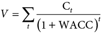 Таким образом, стоимость компании (V) является суммой ее свободных денежных потоков (C) в каждом году (t), дисконтированных на величину стоимости ее капитала; а она – это средневзвешенная стоимость капитала (WACC), которая является средней величиной между стоимостью собственного капитала и стоимостью привлеченных средств: