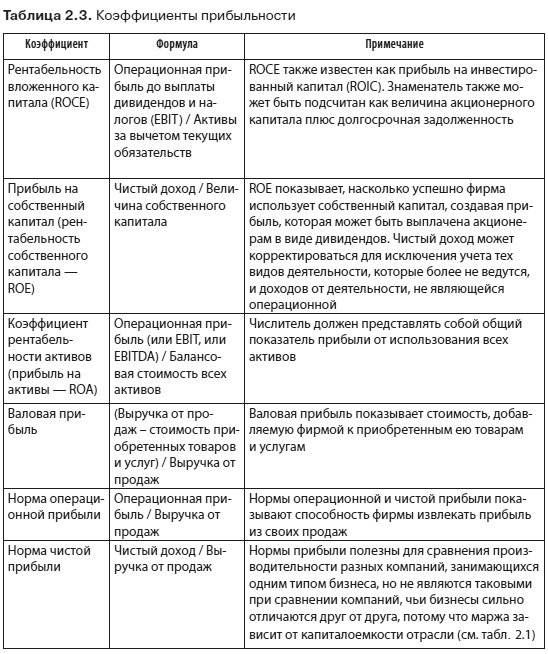 Рентабельность вложенного капитала (ROCE) или тесно связанные с ней индикаторы, такие как рентабельность собственного капитала (ROE) и рентабельность активов (ROA), являются полезными показателями эффективности фирмы в отношении получения прибыли от своих активов. Действительно, в подходе McKinsey для оценки стоимости компании используются ROCE, темпы роста и стоимость капитала18. Однако каждый коэффициент прибыльности подвержен ограничениям и систематическим ошибкам. Следовательно, несколько показателей могут создать более сбалансированную картину эффективности компании. В табл. 2.3 перечислены некоторые широко используемые показатели рентабельности.