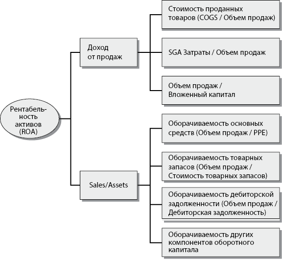 Если показатели прибыли неудовлетворительные, надо определить причины низкой эффективности, чтобы менеджмент компании смог принять необходимые меры и внести коррективы. Главным инструментом подобной диагностики является анализ структуры дохода на вложенный капитал, чтобы определить его главные компоненты, служащие драйверами роста прибыли и рыночной стоимости компании. Отправной точкой является разложение рентабельности активов на маржу продаж и оборачиваемость активов (т. е. прибыль/активы = прибыль/продажи продажи/активы). Затем мы можем дополнительно разбить маржу продаж и оборачиваемость активов на составляющие их элементы (рис. 2.2). Это будет указывать на конкретные виды деятельности, которые являются источниками низкой производительности.