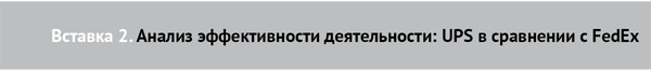 Во вставке 2.2 приведен пример анализа рентабельности активов в случае UPS и FedEx, в результате чего мы можем попытаться определить причины большей прибыльности UPS. Если сложить финансовые данные, количественные показатели стратегий, операционной деятельности и организационной структуры этих двух компаний, а также информацию об общем положении дел в том виде бизнеса, где они конкурируют между собой и с другими рыночными игроками, на этой основе можно сделать вывод, почему UPS показывает большую эффективность, чем FedEx.