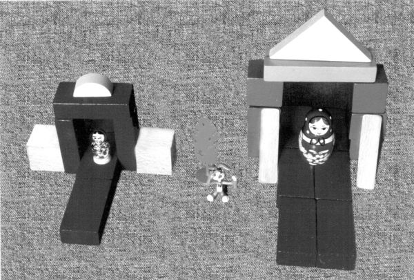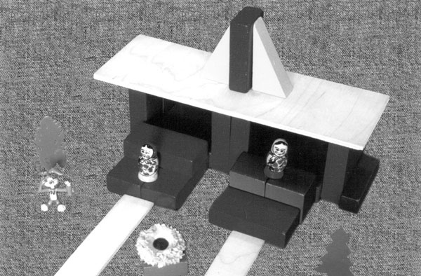 3. Все вертикально стоящие детали надо укрепить с обеих сторон другими (кубиками, призмами, кирпичиками и др.), образно говоря, «завалинками».
