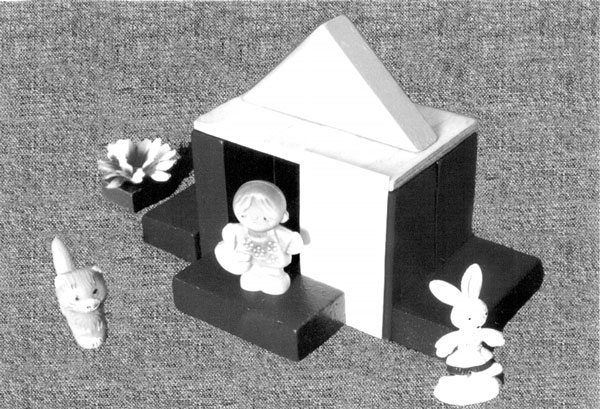 «КЛАССИЧЕСКИЙ ДОМИК». Каркас – «пол» из двух кирпичей, положенных на широкую сторону, а «стены» (слева и справа) из 2 + 2 кирпичей, поставленных на узкую сторону. Устойчивость вертикально поставленным кирпичам придают кирпичи – «пол», а снаружи – «завалинка» (кирпичи, а могут быть и бруски, и призмы); «окно» строится из бруска и арки; «потолок»– из пластины, «крыша» – две призмы (или одна большая), «вход» – лесенка» из одного кирпича, «дверь» из пластины, которую можно двигать (открыта или закрыта дверь).