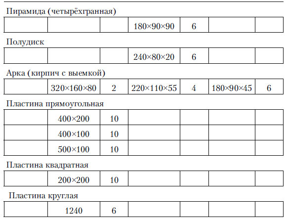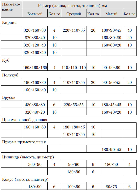 В наборе представлены все геометрические фигуры: кирпичики, кубики, разные призмы, арки, конусы, цилиндры, бруски, пластины, полусферы.
