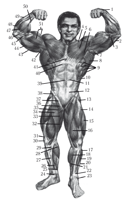 1 – шиловидный отросток лучевой кости; 2 – связка трехглавой мышцы; 3 – межмышечная перегородка; 4 – большая грудная мышца; 5 – ключичная часть; 6 – грудинная часть; 7 – большая круглая мышца; 8 – широчайшая мышца спины; 9 – передняя зубчатая мышца; 10 – косая наружная мышца живота; 11 – прямая мышца живота; 12 – апоневроз; 13 – мышца, напрягающая широкую фасцию бедра; 14 – прямая мышца бедра; 15 – боковая мышца бедра; 16 – средняя мышца бедра; 17 – длинная малоберцовая мышца; 18 – икроножная мышца; 19 – передняя большеберцовая мышца; 20 – длинный разгибатель пальцев; 21 – камбаловидная мышца; 22 – передний удерживатель сухожилий мышц-разгибателей; 23 – боковая лодыжка; 24 – средняя лодыжка; 25 – ахиллово сухожилие; 26