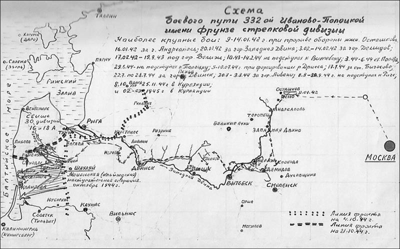 Схема боевого пути 332-й Ивановско-Полоцкой имени М.В. Фрунзе стрелковой дивизии