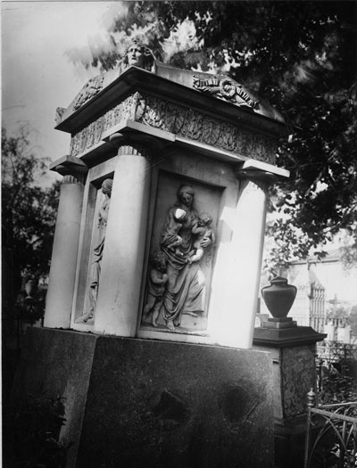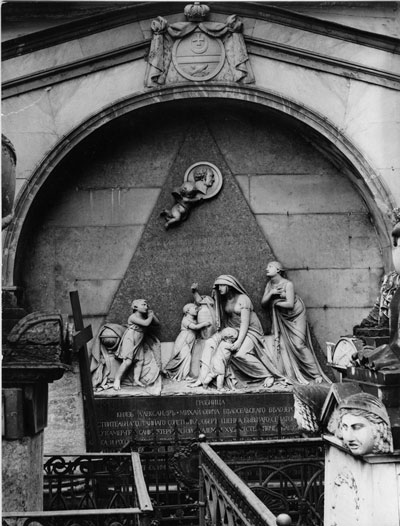 На рубеже XVIII–XIX вв. крупнейшие мастера русского искусства отдали дань мемориальной пластике. Среди скульпторов можно назвать М. И. Козловского (надгробия П. И. Мелиссино, 1800 г.; С. А. Строгановой, 1802 г.); И. П. Прокофьева (надгробия М. Д. Хрущова, Ф. И. Шубина, 1800-е гг.); В. И. Демут-Малиновского (надгробия М. И. Козловского, 1803 г.; П. П. Чекалевского, 1817 г.; Р. Симпсона, 1820-е гг.); С. И. Гальберга (надгробия Н. И. Гнедича, Н. П. Дурново, Е. М. Олениной, 1830-е гг.); И. П. Витали (надгробие А. Г. Белосельской-Белозерской, 1846 г.). С некоторыми надгробными памятниками, выполненными в 1800-х гг. (А. М. Белосельского-Белозерского, В. Я. Чичагова, Е. А. Ранцовой), связывают имя Ж. Тома де Томона[168]. Архитектор Л. Руска проектировал надгробия дочерей Александра I в Благовещенской церкви (1807 г.) и грузинских царевичей на Лазаревском кладбище (1808 г.)[169]. Существует эскиз А. Н. Воронихина, по которому, очевидно, было создано надгробие П. А. Талызина (1800-е гг.). О. Монферран разрабатывал проекты надгробий в Духовской церкви (1820-е гг.)[170]. Ф. П. Толстой создал надгробие И. В. Кусова (1822 г.), А. И. Мельников – И. П. Мартоса (1836 г.), А. П. Брюллов – М. М. Сперанского (1839 г.)[171]. Наряду с этими памятниками, авторство которых устанавливается документально, петербургский некрополь сохранил множество надгробий высокого художественного уровня, остающихся неатрибутированными. Среди них есть уникальные, не имеющие аналогов на других петербургских кладбищах, но встречаются и повторения, восходящие к какому-либо популярному образцу.