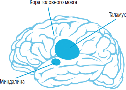 Путь миндалины. Таламус, этот нейросекретарь, также следит и за безопасностью – одновременно с отправкой сенсорной информации в нужную часть коры головного мозга он посылает ее напрямую в миндалину. На рисунке 1 видно, что миндалина расположена рядом с таламусом и, соответственно, получает информацию быстрее, чем остальные части мозга. Такое расположение миндалины позволяет ей выполнять роль системы предварительной сигнализации, быстро обрабатывая информацию с целью выяснить, насколько она важна. Ваша миндалина видит, слышит и ощущает все раньше, чем вы сами, поскольку ваше восприятие информации зависит от относительно более медленной ее обработки различными долями коры головного мозга.