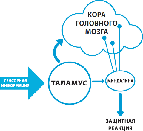 То, что вы видите, слышите и ощущаете, зависит от коры головного мозга – то есть все, что вы испытываете посредством органов чувств, проходит по этому пути. По пути миндалины, который в том числе отвечает за переживание тревоги, информация от органов чувств поступает в таламус, а затем напрямую в миндалину, и происходит это за миллисекунды. Миндалина непрерывно следит за всем, что с вами происходит, и замечает все быстрее, чем вы. Поскольку ваше восприятие зависит от коры головного мозга, вы не видите и не слышите, какую именно информацию обрабатывает миндалина, и не понимаете, почему ваши мышцы напрягаются или отчего начинает колотиться сердце, но ощущаете эти телесные реакции, то есть защитные реакции, запускаемые миндалиной при обнаружении ею потенциальной угрозы.