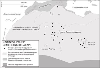 Совсем недавно, скажем, около 3000 года до н. э., на территории нынешней пустыни Сахара водились такие животные, как слоны и гиппопотамы; еще удивительнее то, что здесь обитали народы, занимавшиеся стадным разведением коров, овец и коз. Сегодня Сахара считается самой быстрорастущей пустыней в мире. Но то, что теперь представляется безводной пустыней, когда-то выглядело плодородной саванной, рассеченной полноводными реками, стекавшими к Нигеру, а еще одна дренажная система протяженностью 1200 километров замыкалась озером Чад.