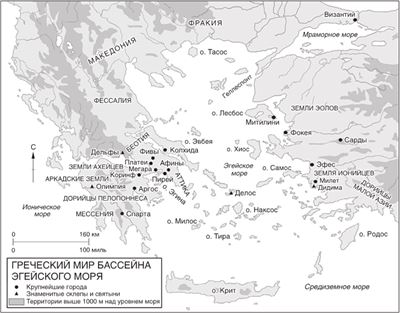 Но все равно такие связи с точки зрения политики никогда особой роли не играли. Они вряд ли служили укреплению единства из-за самого театра греческой истории, которая на самом деле относилась не к грекам, а скорее к бассейну Эгейского моря в целом. Предшествовало всему широкое распространение минойского и микенского влияния на заре цивилизации, тем более что практически круглогодично существовала возможность беспрепятственного сообщения по воде между множеством островов и побережий этого моря. Появление греческой цивилизации вообще можно объяснить особенностями географии ее распространения. Прошлое тоже, разумеется, что-то да значило, но минойский Крит и Микены вполне могли оставить Греции меньшее наследие, чем англосаксонская Англия оставила поздней Великобритании. Окружение играло более важную роль, чем история, так как его составляла группа жизнеспособных с хозяйственной точки зрения сообществ людей, общавшихся на одном языке и пользовавшихся легким выходом не только друг на друга, но и к центрам цивилизации на Ближнем Востоке возрастом постарше. Точно так же, как древние речные долины – но по иным причинам, – бассейн Эгейского моря оказался удачным местом для сотворения цивилизации.