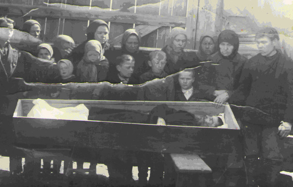 И осталась в 1940 г. моя маленькая худенькая 32-летняя неграмотная мама без средств к существованию, без работы, с тремя маленькими детьми: Толе – 10 лет, мне – 5 лет, Вите – 3 года. На фотографии с похорон деда мы все там есть. Такими и были после ухода отца. А в поселке, кроме шахты, всех «учреждений» – школа и магазин. Но маму почему-то не брали на работу. (Сейчас-то понятно, почему).