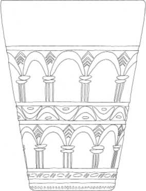 В Хорасане IX–X вв. появление колонного ряда в керамике и на стекле нередко. Например, на стеклянных бутылках и бокалах из Нишапура мы встречаем сходный колонный ряд, охватывающий тулово изделий13. Бокал покрыт двойным рядом колонн, их разделяет орнамент. В обоих случаях колонны представлены с импостами, а в интерколумнии на бокале весьма схематично изображен ряд небольших тромпов. Мы возвращаемся к блюду с изображением инжира и колонного ряда.