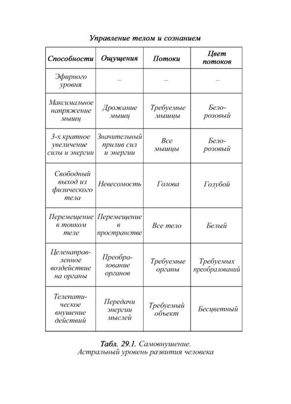10. Способность управления своим телом – включает в себя все способности управления телом физического, эфирного и астрального уровня, развитие максимально возможных физических усилий, пятикратное увеличение физической силы за счет входа в особые состояния, свободный выход из физического тела и перемещение в тонком теле в пределах Солнечной системы, целенаправленное воздействие на системы органов и телепатическое воздействие на системы органов и телепатическое внушение действий и мыслей.