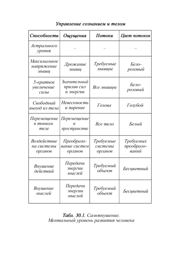 10. Способности управления своим телом – включают в себя все способности управления физическим телом физического и эфирного уровней развития, вызов максимального напряжения требуемых мышц, трехкратное увеличение физической силы за счет входа в особые состояния, свободный выход из тела, перемещение в тонком теле в пределах Земли, целенаправленное воздействие на внутренние органы и телепатическое внушение действий.