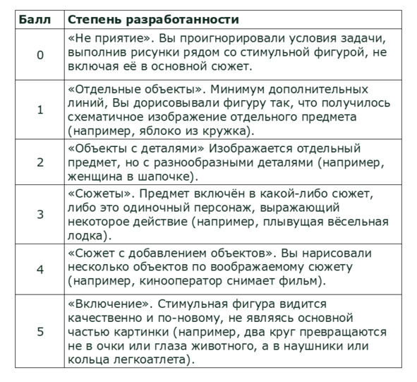 181 – 300 баллов: высокий уровень разработанности. Этот результат удаётся немногим. Похоже, что вы прирожденный изобретатель и художник! Образы вспыхивают у вас в мозгу, как звёзды на ночном небе, и вы их тут же умело переносите на бумагу. Отличный результат! Примите наши поздравления.