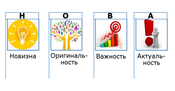 В своей книге «Человек креативный: особенности мышления и личности» доктор психологических наук Л. Я. Дорфман предложил модель НОВА по первым буквам отмеченных им четырёх основных признаков творческой идеи:
