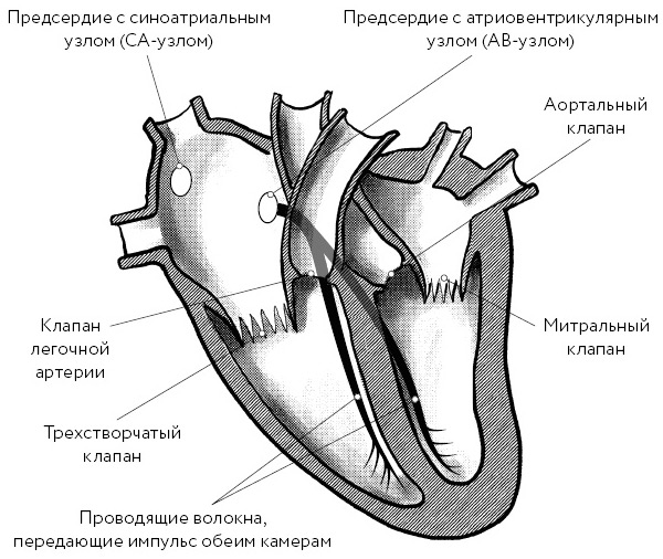 Сердце работает как насос, его образует мышечная ткань – миокард, способная сокращаться. Внутри него – четыре отдела (камеры) и четыре клапана. Сердце состоит из двух частей – левой и правой. Они не сообщаются между собой непосредственно, а вот сокращаются синхронно – к этому их стимулируют повторные импульсы, возникающие в проводящей системе сердца (рис. 2.1).