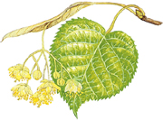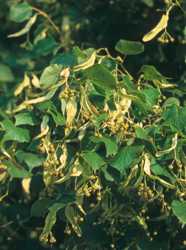 The common lime is a cultivated hybrid between the two species of native wild lime, small-leaved (Tilia cordata) and large-leaved (T. platyphyllos), and it is now much commoner than both. It is one of the most beneficent of trees: its branches are a favourite site for mistletoe; its inner bark, bast, was used for making twine; its pale, close-grained timber is ideal for carving; its fragrant flowers make one of the best honeys. Limes are remarkable for the fact that they can, in bloom, be tracked down by sound. In high summer their flowers are often so laden with bees that they can be heard 50 m (160 ft) away. The leaves make a useful salad vegetable. When young they are thick, cooling, and very glutinous. Before they begin to roughen, they make a sandwich filling, between thin slices of new bread, with unsalted butter and just a sprinkling of lemon juice. Cut off the stalks and wash well, but otherwise put them between the bread as they come off the tree. Some aficionados enjoy them when they are sticky with the honeydew produced by aphid invasions in the summer. In late June and July the yellow flowers of mature lime trees have a delicious honey-like fragrance, and make one of the very best teas of all wild flowers. It is popular in France, where it is sold under the name of tilleul.