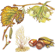 An abundant and widespread tree, found in woods, hedgerows and scrubland. A small tree or multi-stemmed shrub, 1.5–3.5 m (4–12 ft) high, with roundish, downy, toothed leaves. Well known for the yellow male catkins, called ‘lambs’ tails’, which appear in the winter. Nuts from late August to October, 1–2.5 cm (½–1 inch) long, ovoid and encased in a thick green-lobed husk.
