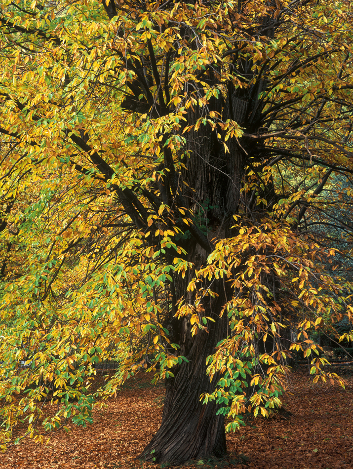The ripe nuts begin to fall late in October, and can be helped on their way with a few judiciously thrown sticks. Opening the prickly husks can be a painful business, and for the early part of the crop it is as well to take a pair of gloves and some strong boots, the latter for splitting the husks underfoot, the former for extricating the fruits. The polished brown surface of the ripe nuts uncovered by the split husk is positively alluring. You will want to stamp on every husk you see, and rummage down through the leaves and spines to see if the reward is glinting there.