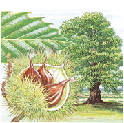 Well distributed throughout England, though scattered in Scotland. Common in woods and parks. A tall, straight tree, up to 30 m (100 ft), with single spear-shaped serrated leaves. Nuts in October and November, two or three carried in spherical green cases covered with long spines.