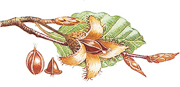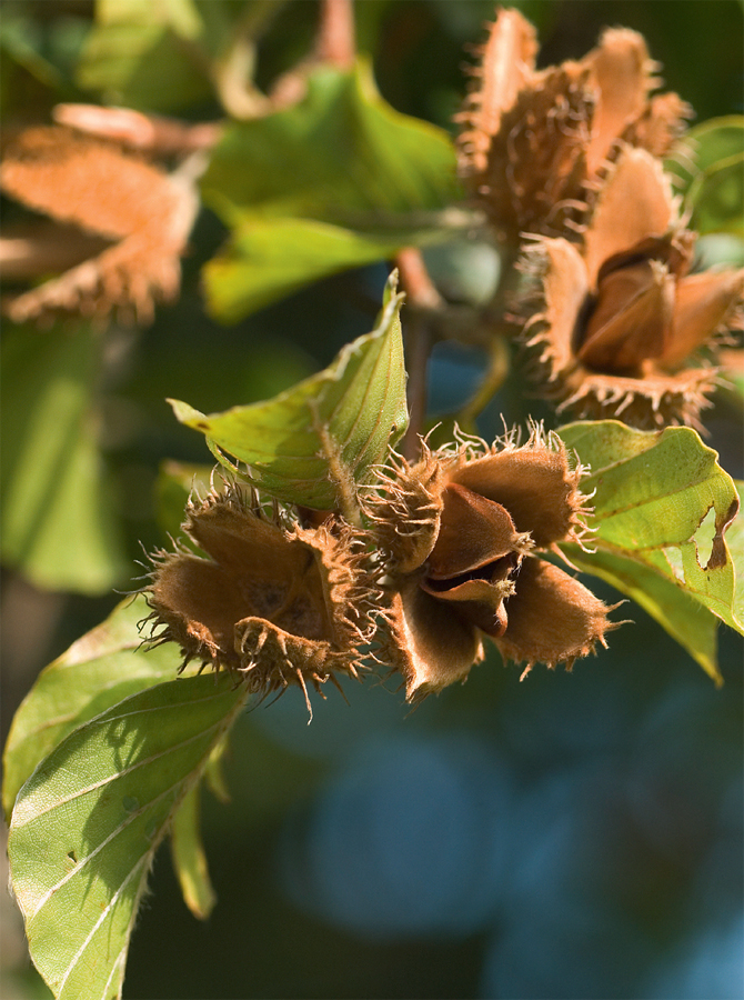 Widespread and common throughout the British Isles, especially on chalky soils. A stately tree, up to 40 m (130 ft), with smooth grey bark and leaves of a bright, translucent green. Nuts in September and October, four inside a prickly brown husk. When ripe this opens into four lobes, thus liberating the brown, three-sided nuts.