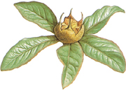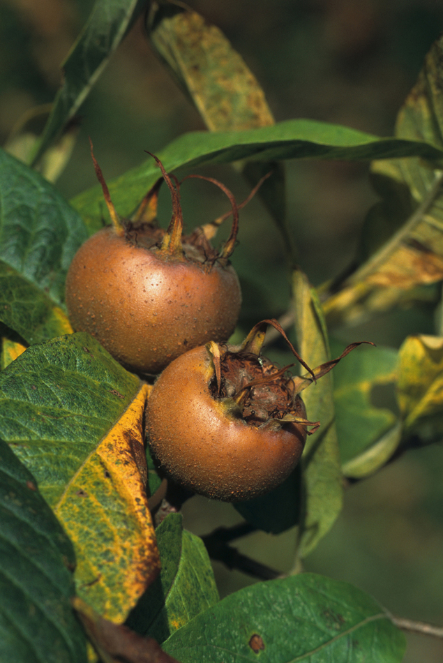 Medlar was, together with quince, mulberry and walnut, one of the quartet of trees that were usually planted singly in old herb gardens, often at the corners. They are now largely out of fashion in cultivation, and are probably not native in Britain. Yet the odd tree can still be found in old parkland and orchards, and, in the south of England, in hedgerows and woods near farms. These may be bird-sown, naturalised specimens; but fruit trees were occasionally planted out in these sites so as not to take up cultivated ground. Medlars are remarkable for their dark contorted trunks, their solitary white flowers which sit on the trees like camellias, and for the large brown fruits that start to fall from the tree in November. Although they were once recommended as a treatment for diarrhoea, they are wood-hard in this state and must be allowed to ‘blet’, or decay, before they are edible. Kept in a warm, dry place for a couple of weeks, the flesh browns, sweetens and softens to a consistency something like that of chestnut purée.