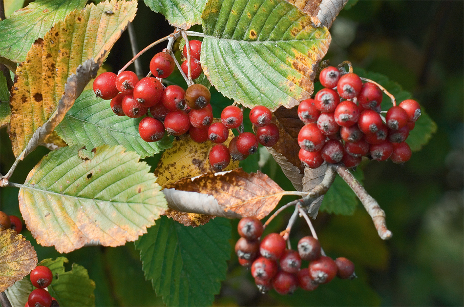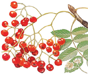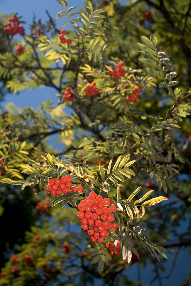 Widespread and common in dry woods and rocky places, especially on acid soils in the north and west of the British Isles. A small tree, up to 20 m (65 ft), with fairly smooth grey bark, toothed pinnate leaves, and umbels of small white flowers. Fruit: large clusters of small orange or red berries, August to November.