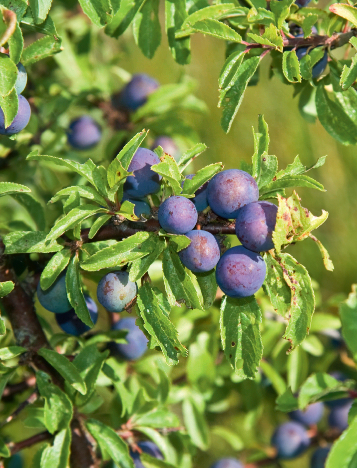 The sloe is one of the ancestors of cultivated plums. Crossed with the cherry plum (Prunus cerasifera), selected, crossed again, it eventually produced fruits as sweet and sumptuous as the Victoria plum. Yet the wild sloe is the tartest, most acid berry you will ever taste. Just one cautious bite into the green flesh will make the whole of the inside of your mouth creep. But a barrowload of sloe-stones was collected during the excavation of a Neolithic lake village at Glastonbury. Were they just used for dyeing? Or did our ancestors have hardier palates than us? For all its potent acidity, the sloe is very far from being a useless fruit. It makes a clear, sprightly jelly, and that most agreeable of liqueurs, sloe gin.