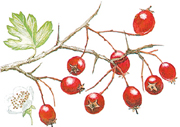 Hawthorn berries (haws) are perhaps the most abundant berry of all in the autumn. Almost every hawthorn bush is festooned with small bunches of the round, dark-red berries, looking rather like spherical rosehips. When fully ripe they taste a little like avocado pear. They make a moderate jelly, but being a dry fruit need long simmering with a few crab apples to bring out all the juices and provide the necessary pectin. Otherwise the jelly will be sticky or rubbery. It is a good accompaniment to cream cheese.