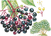 Widespread and common in woods, hedgerows and waste places. A tall, fast-growing shrub, up to 10 m (33 ft), with a corky bark, white pith in the heart of the branches, and a scaly surface to the young twigs. Leaves usually in groups of five; large, dark green and slightly toothed. Flowers are umbels of numerous tiny creamy-white flowers, June to July. Fruits are clusters of small, reddish-black berries, August to October.