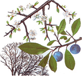 Widespread and abundant in woods and hedgerows throughout the British Isles, though thinning out in the north of Scotland. A stiff, dense shrub, up to 6 m (20 ft) high, with long thorns and oval leaves. The flowers are small and pure white and appear before the leaves. The fruit is a small, round, very dark blue berry covered when young with a paler bloom.